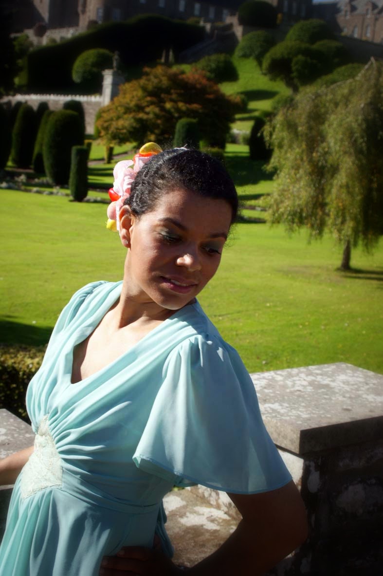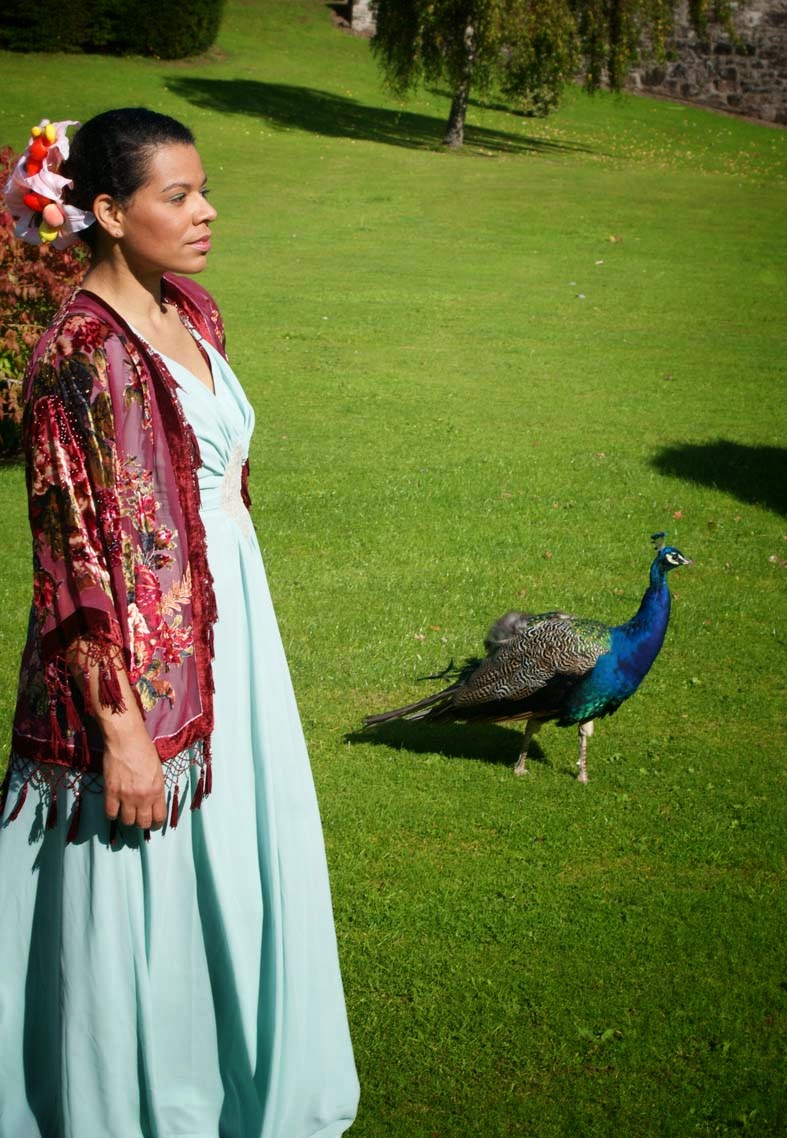 I love peacocks too, and this gown is stunning on you.What a glorious castle, I really love that intro image. xx/M